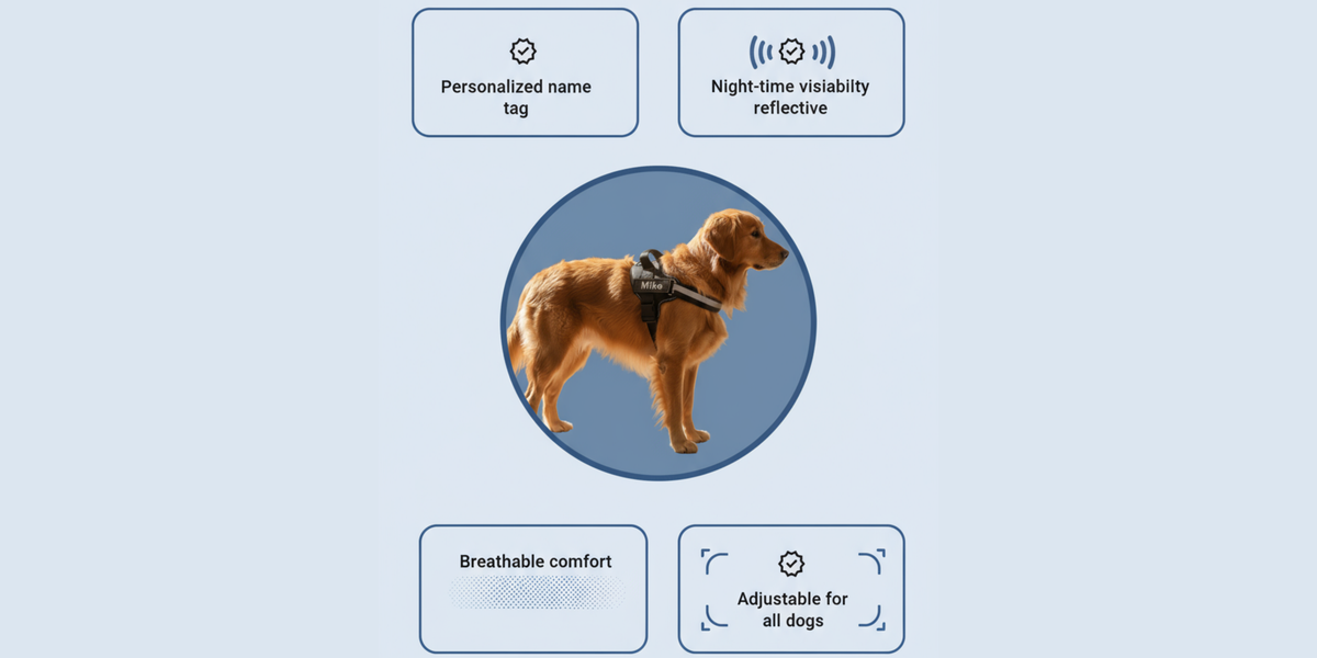 Yes — This harness has a customizable patch for your dog’s name. Just enter your dog’s name and your phone number in the fields above the Add to Cart button. Your details will be automatically saved with the order, and we’ll print them directly on the patch.